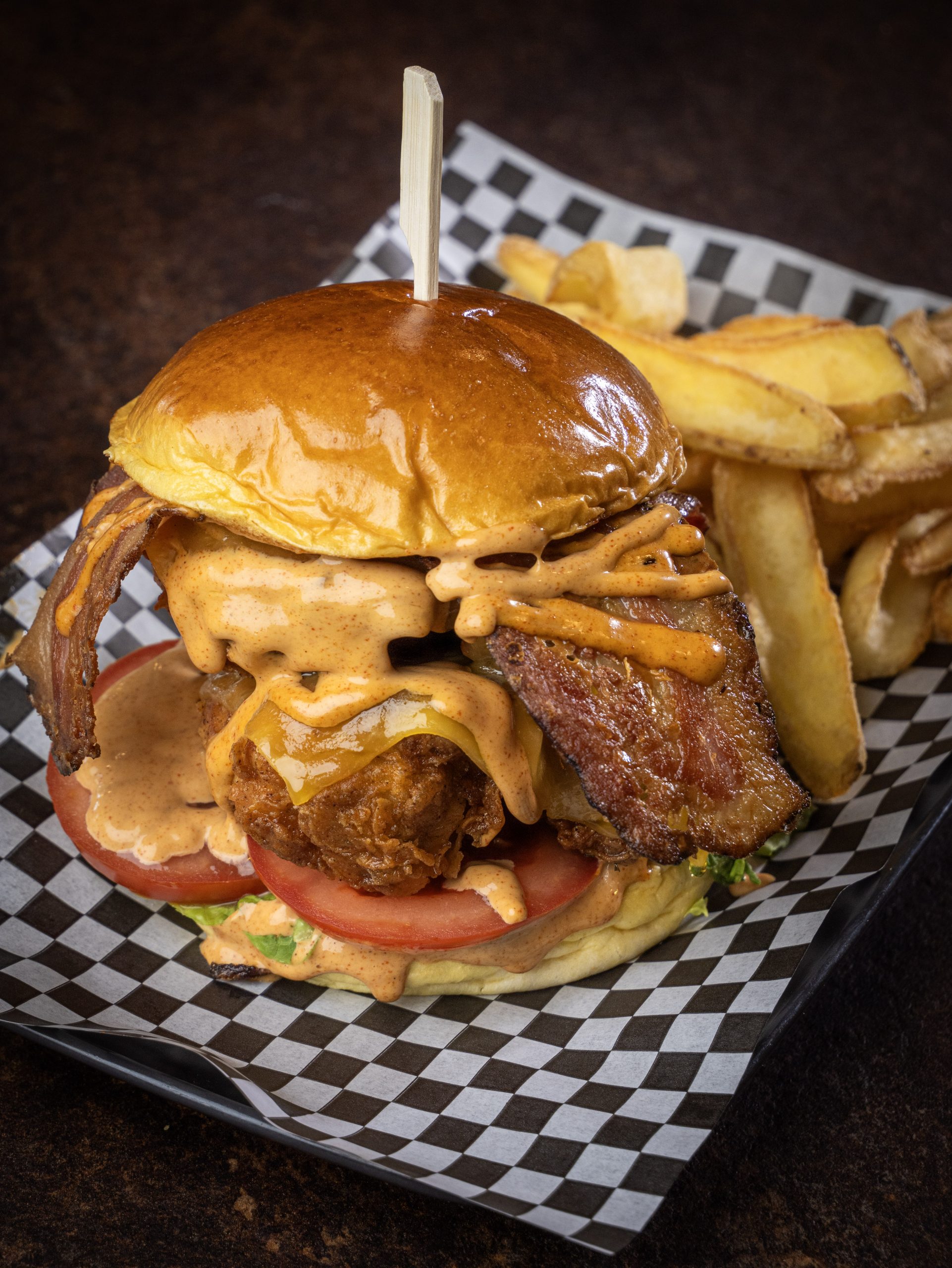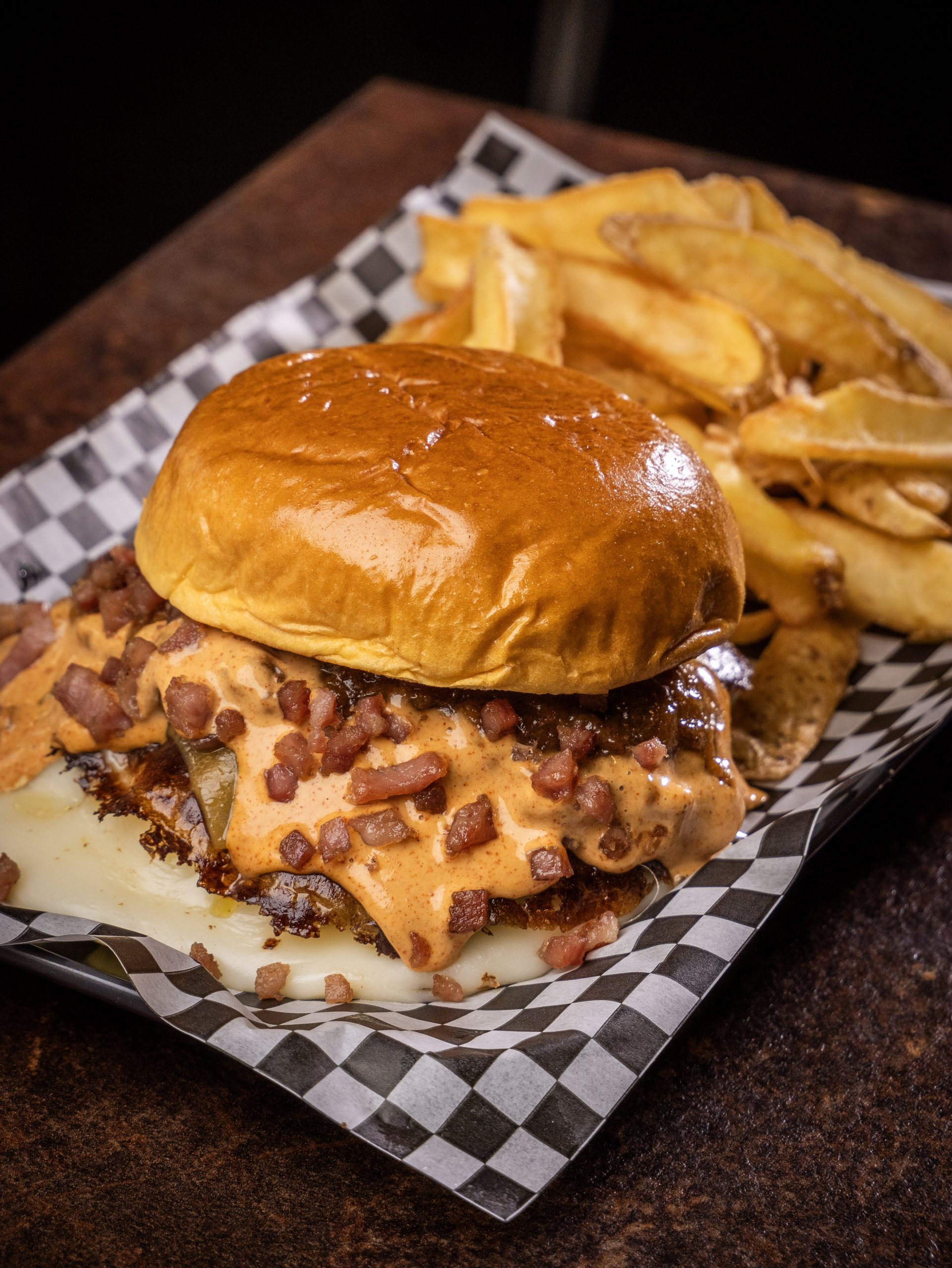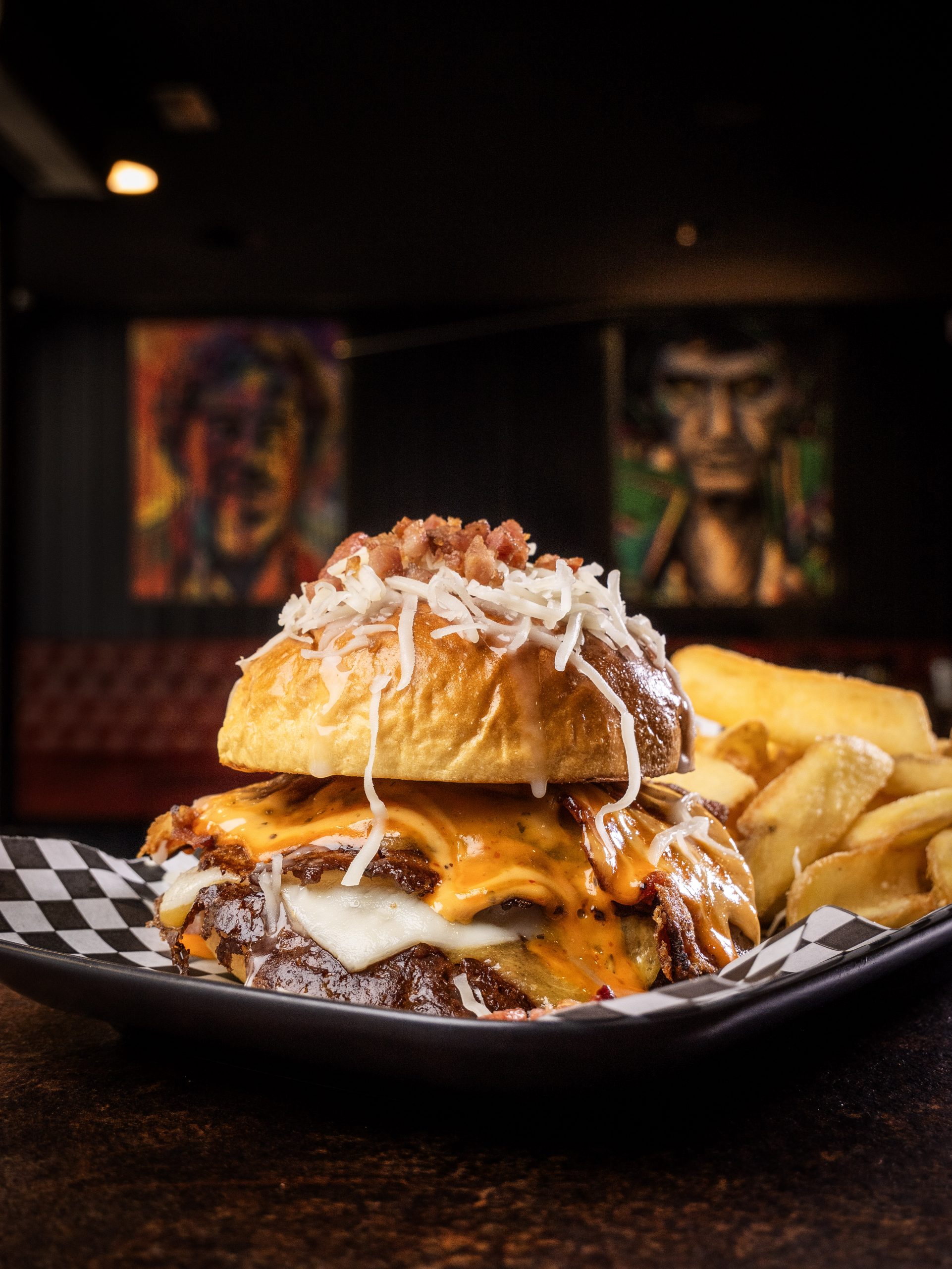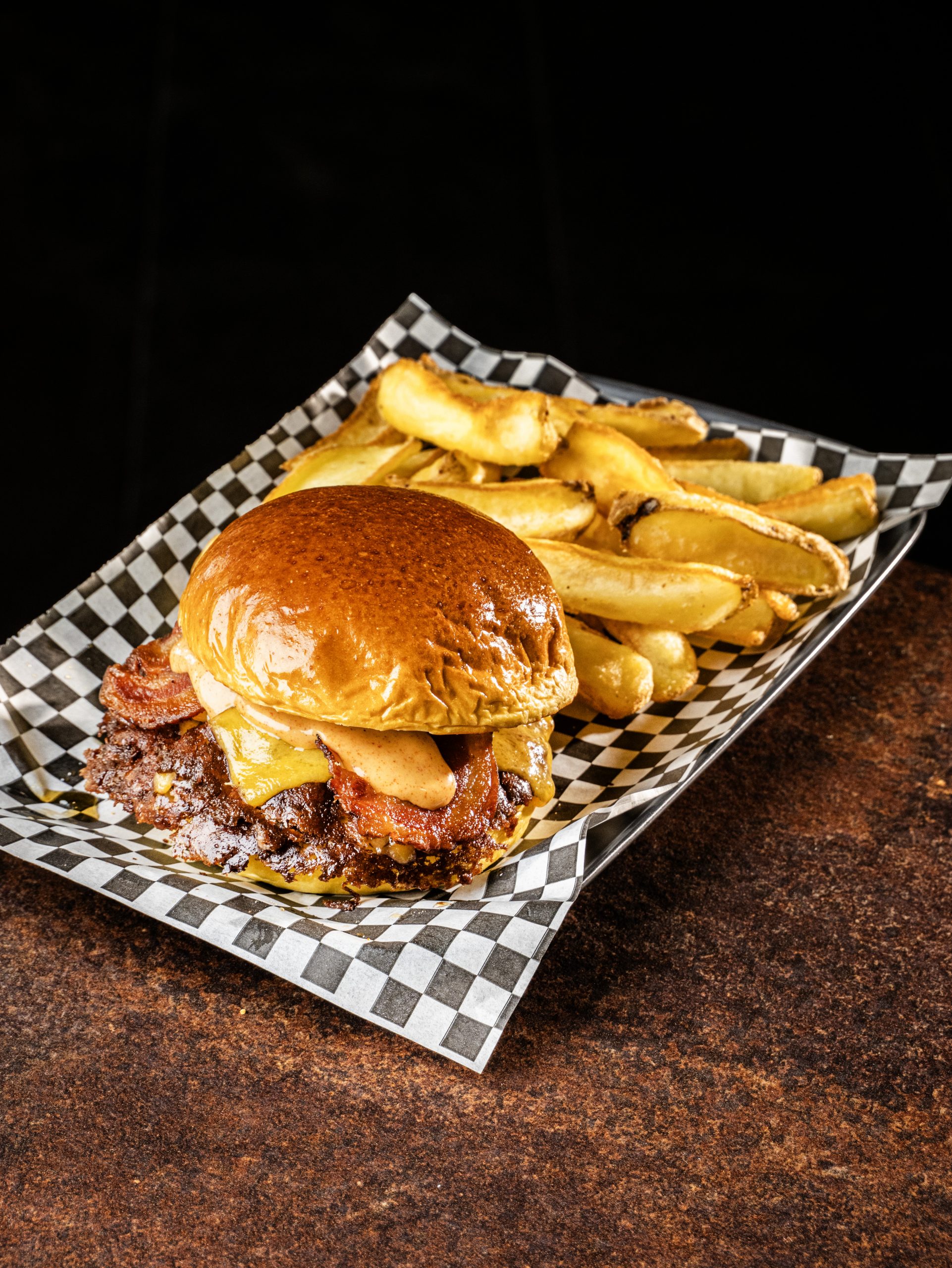 Doble carne smash, pan brioche potato rolls, glaseado de limón, provolone, cheddar madurado, queso curado, tiras de bacon, siracha mayo, smokey bacconaise y bacon bits.