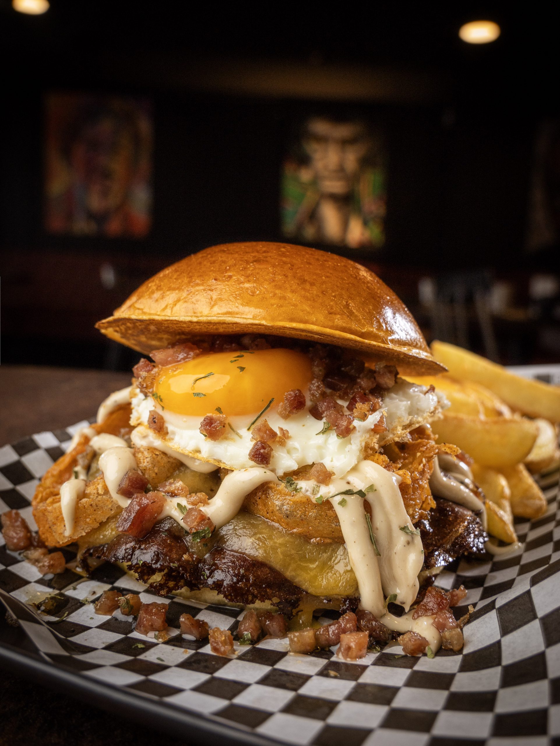 Doble carne smash, pan brioche potato rolls, doble queso chedar rojo, bacon bits, aros de cebolla crunchy, huevo frito, salsa bandidos y salsa trufada.