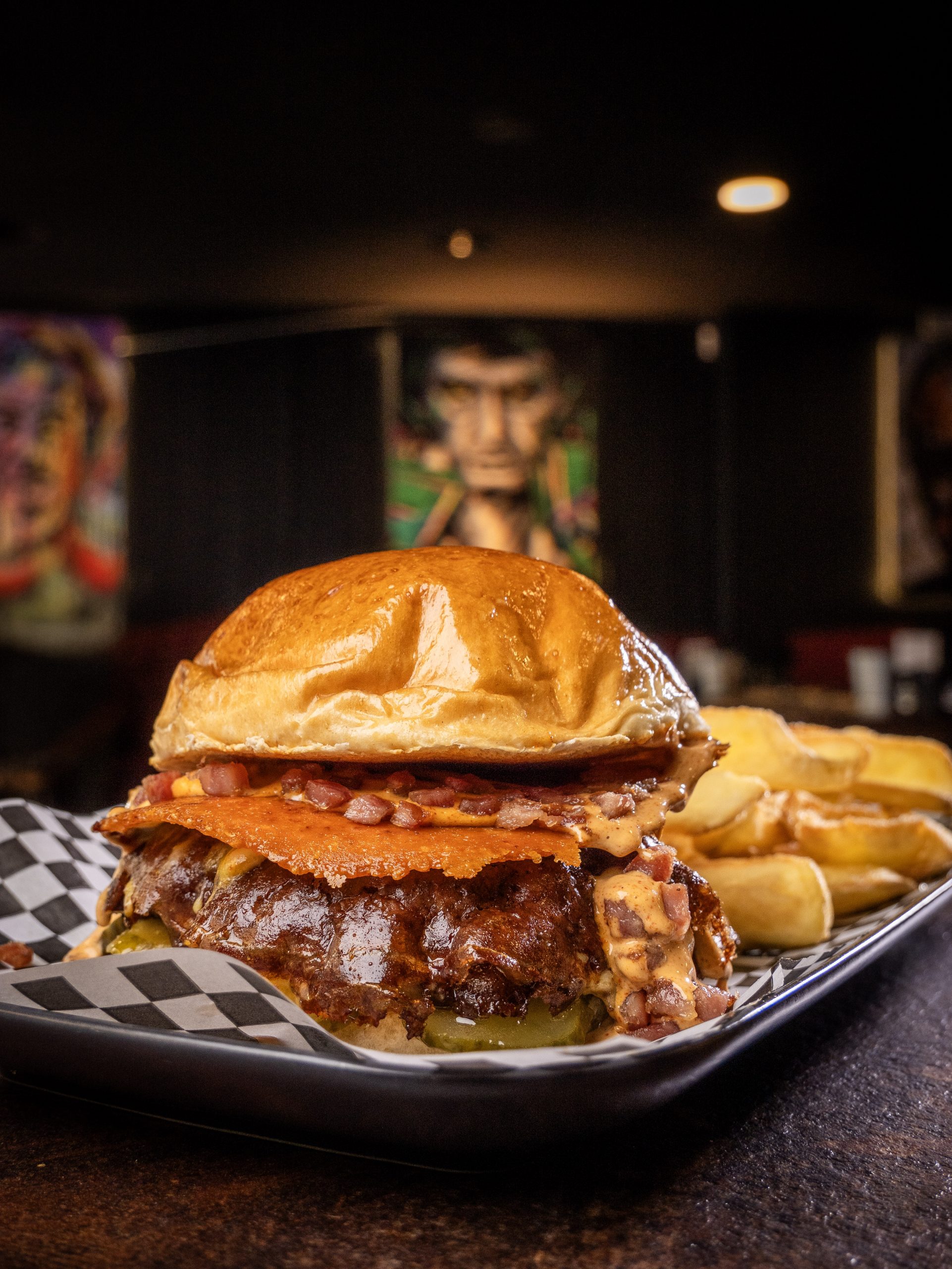 Doble carne smash, ppan brioche potato rolls, doble cheddar rojo, cebolla en plancha con mostaza, provolones smash, bacon bits, pepinillo y salsa Bandido’s.
