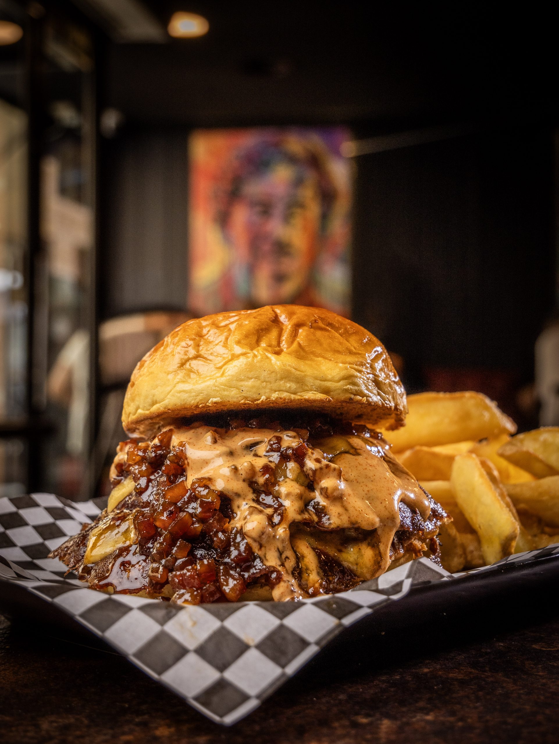 Doble carne smash, pan brioche potato rolls, doble queso chedar rojo, salsa bandidos, mermelada de bacon y cebolla crispy.