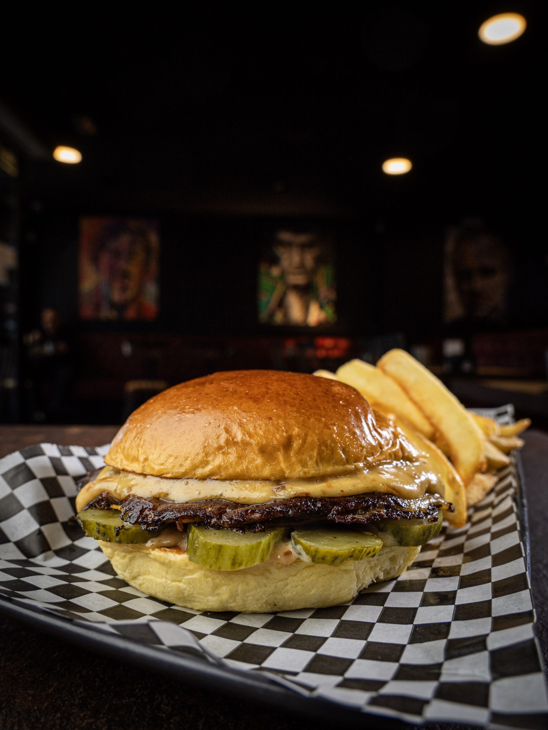 Carne smash de vaca rubia, pan brioche potato rolls, salsa emmy, pastrami, queso cheddar madurado, cebolla caramelizada y pepinillos.
