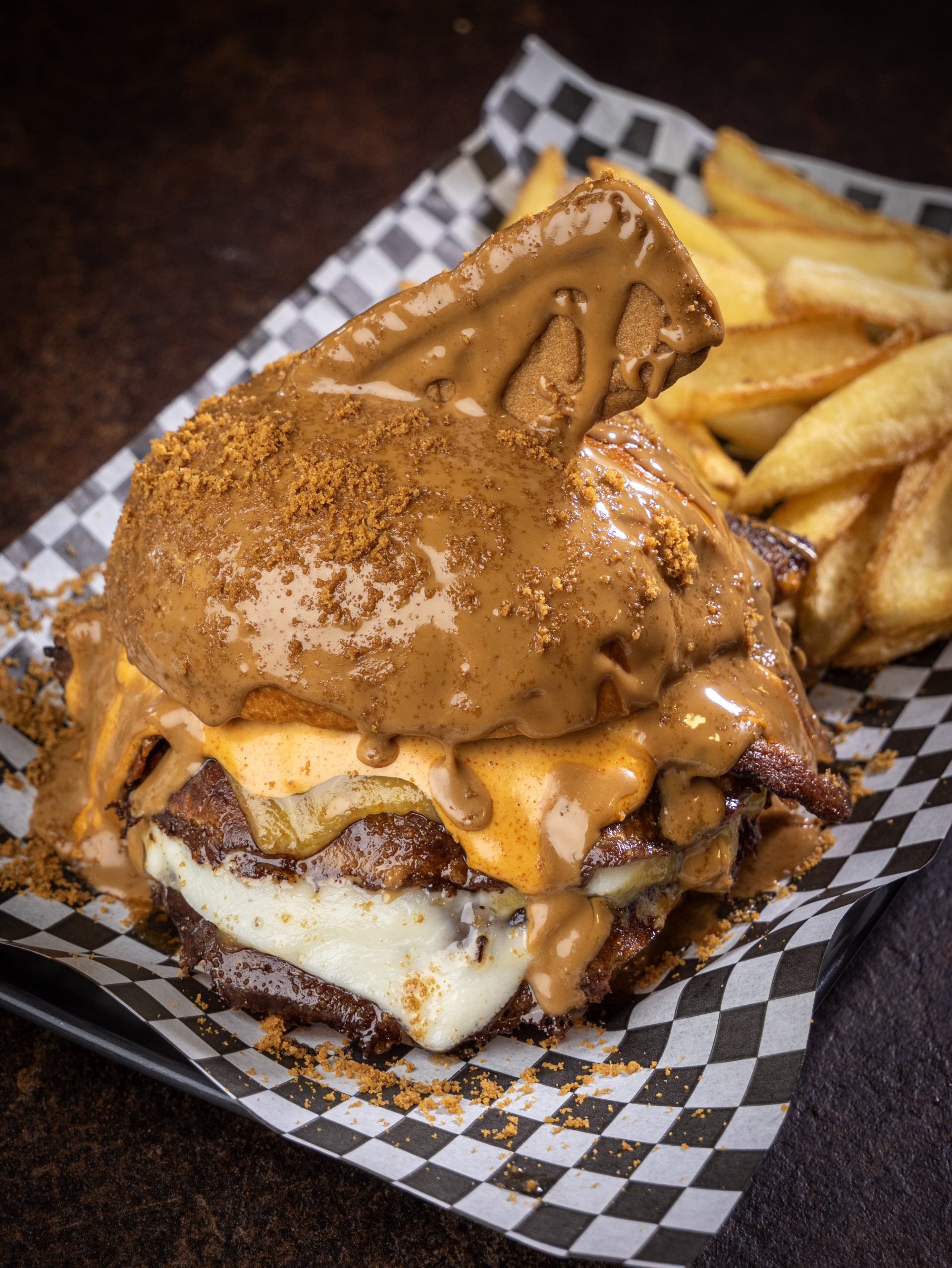 Doble carne smash, pan brioche potato rolls, doble cheddar rojo, queso blanco curado, doble bacon, salsa Bandido’s, crema y galleta de lotus.
